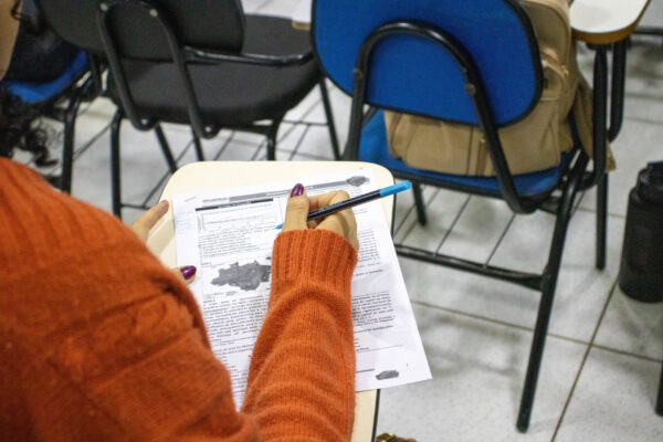 Alunos concentrados na resolução de um simulado